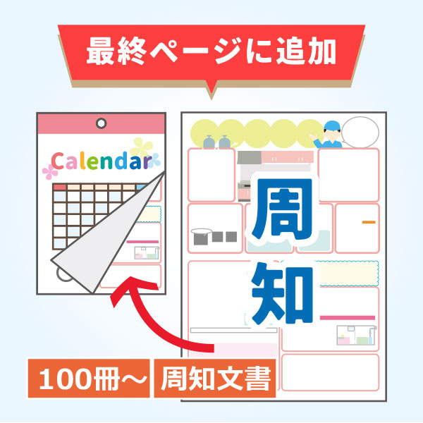 いつも配布しているカレンダーと同じ、または同じ仕様のカレンダーに保安周知文書を1枚追加して綴じることができるので、長年積み上げてきたお店のイメージはそのままに保安周知文書のついたカレンダーを配布することができます。